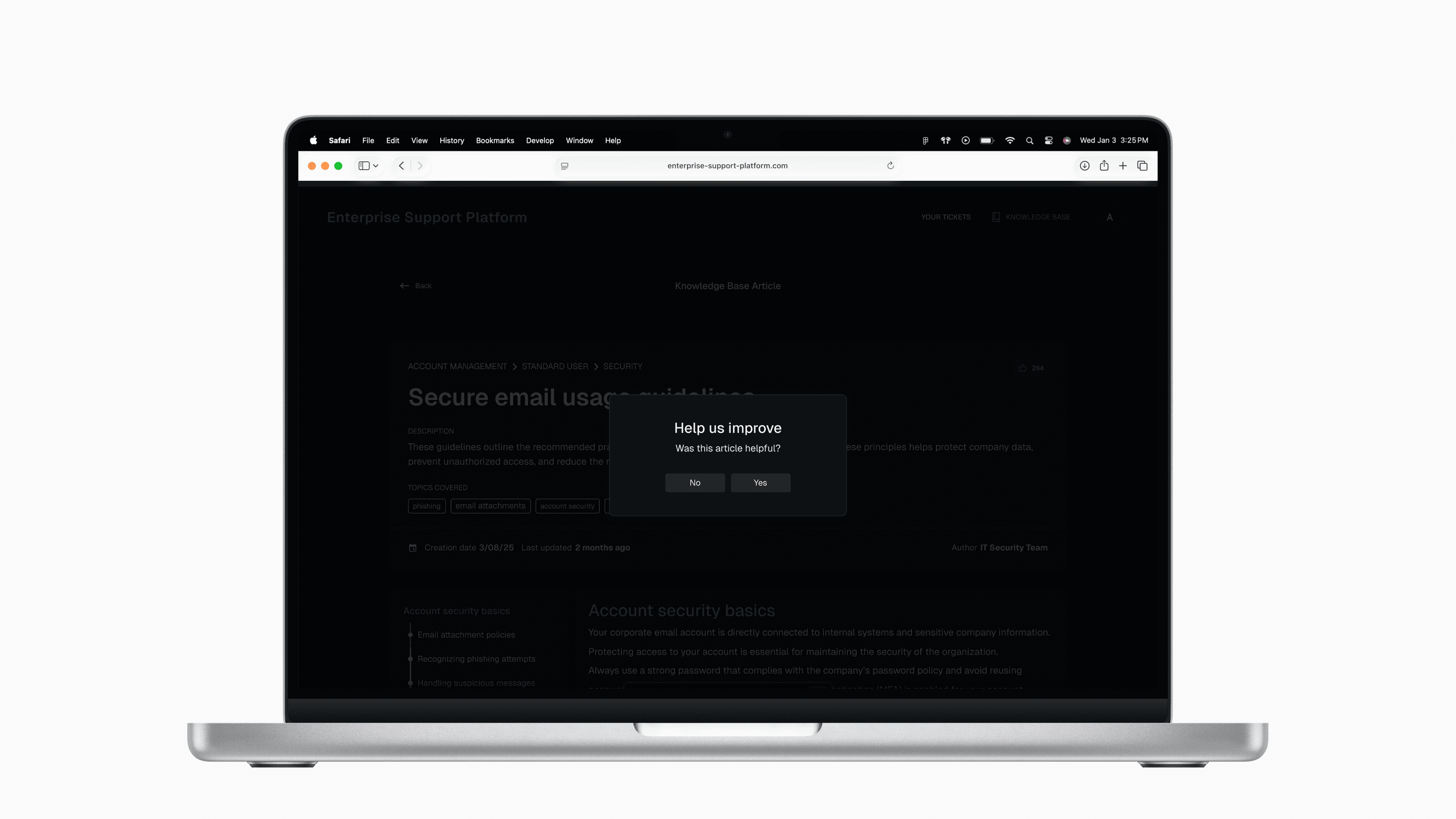 The goal was to reduce unnecessary ticket creation by strengthening self-service through AI-assisted knowledge retrieval.